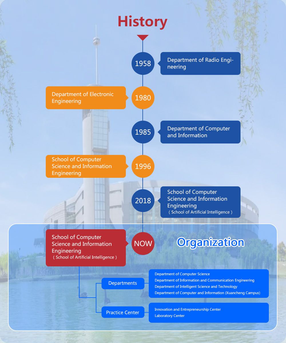 The School of Computer Science and Information Engineering was established in 1958, marking its 65th anniversary. We currently employ a total of 210 faculty members, comprising 56 professors, 93 associate professors, 46 doctoral advisors, and 148 master supervisors.