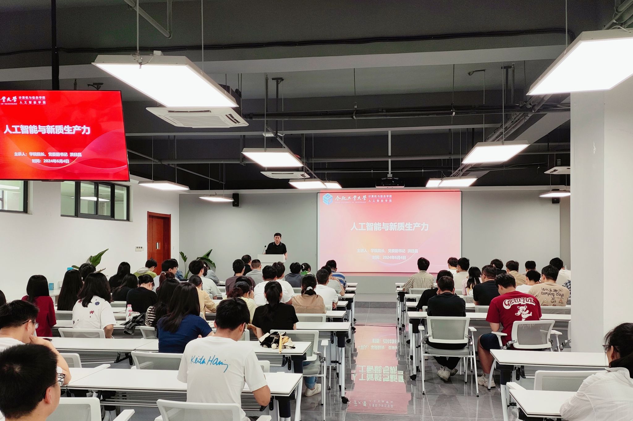 在翡翠科教楼B座501会议室举办“人工智能与新质生产力”主题党课,学院院长洪日昌受邀主讲,全体研究生党员参加学习。