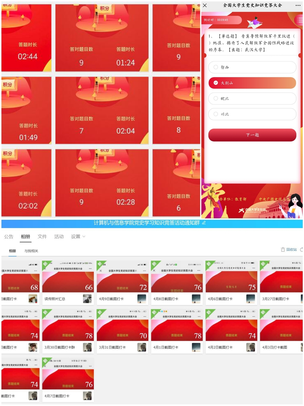 本次知识竞答活动围绕中国共产党百年党史相关内容展开,依托“中国大学生在线”微信公众号中的“党史答题”栏目,通过创建答题QQ群使参与学生通过每日答题、群聊打卡、感悟分享等学习党的历史、传承党的精神。活动期间,同学们坚持每日答题,积极打卡,在相互促进、寓学于乐的氛围中学习党史,增进对党的了解,提升思想觉悟,强化政治素养。群内一张张截图反映出同学们对本次党史知识竞答活动的热情。同学们表示通过参加本次党史知识竞赛活动掌握了更多的党史知识,深刻体悟到了党的初心使命和伟大精神,也激励着自己在今后的学习生活中牢记初心使命,赓续中国共产党人的精神血脉。