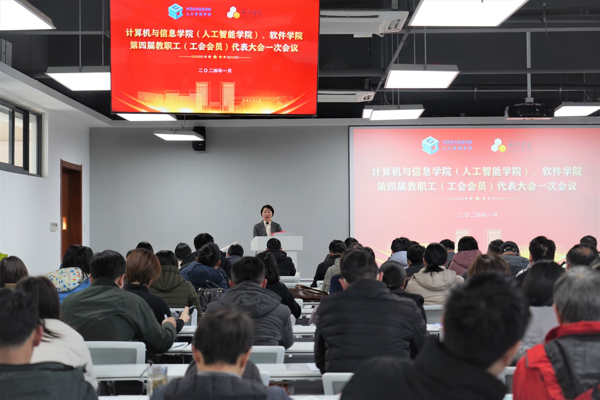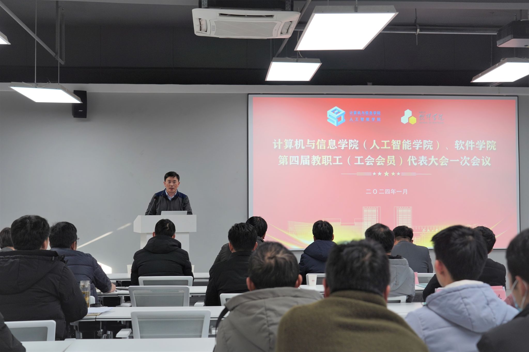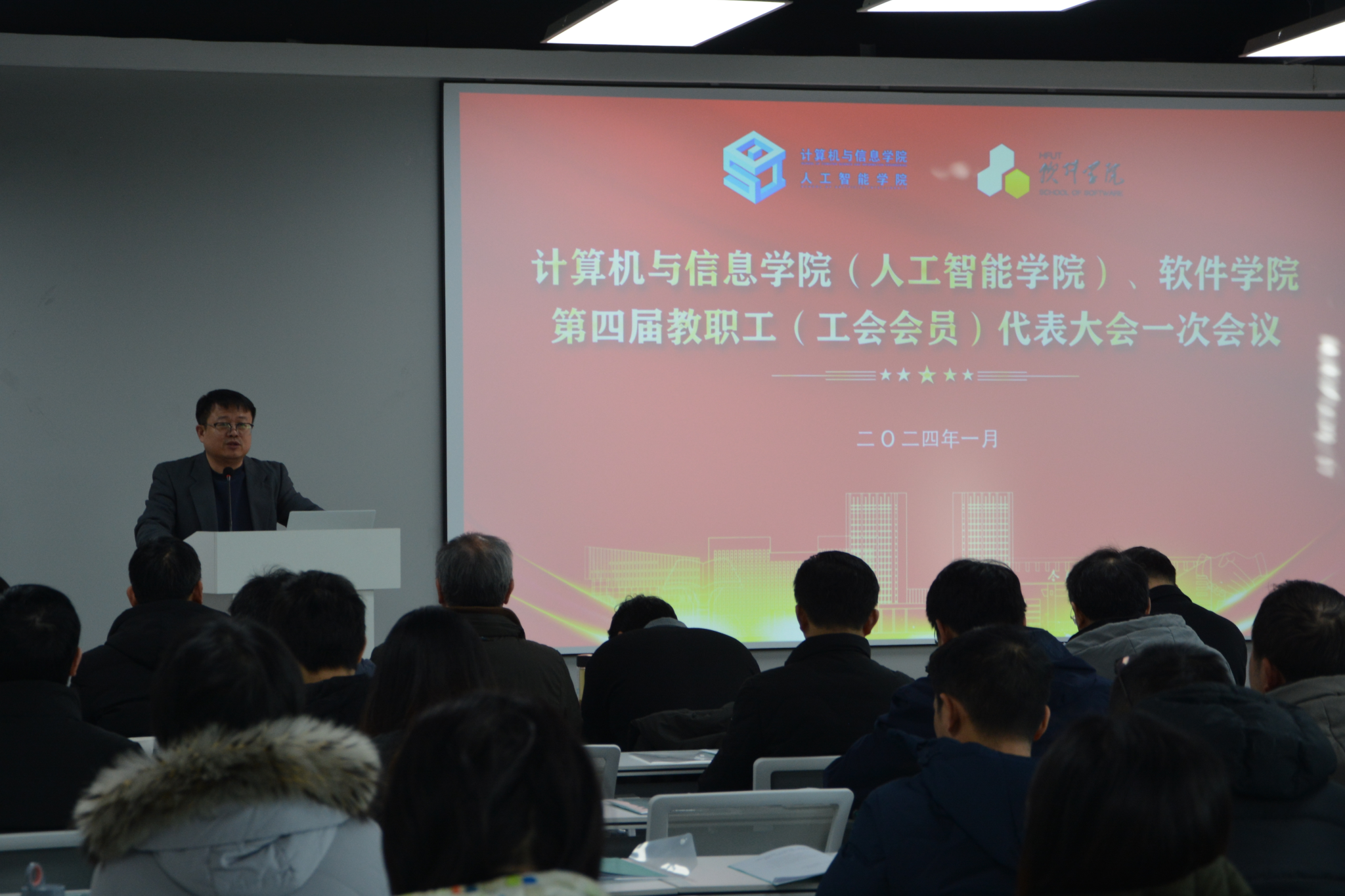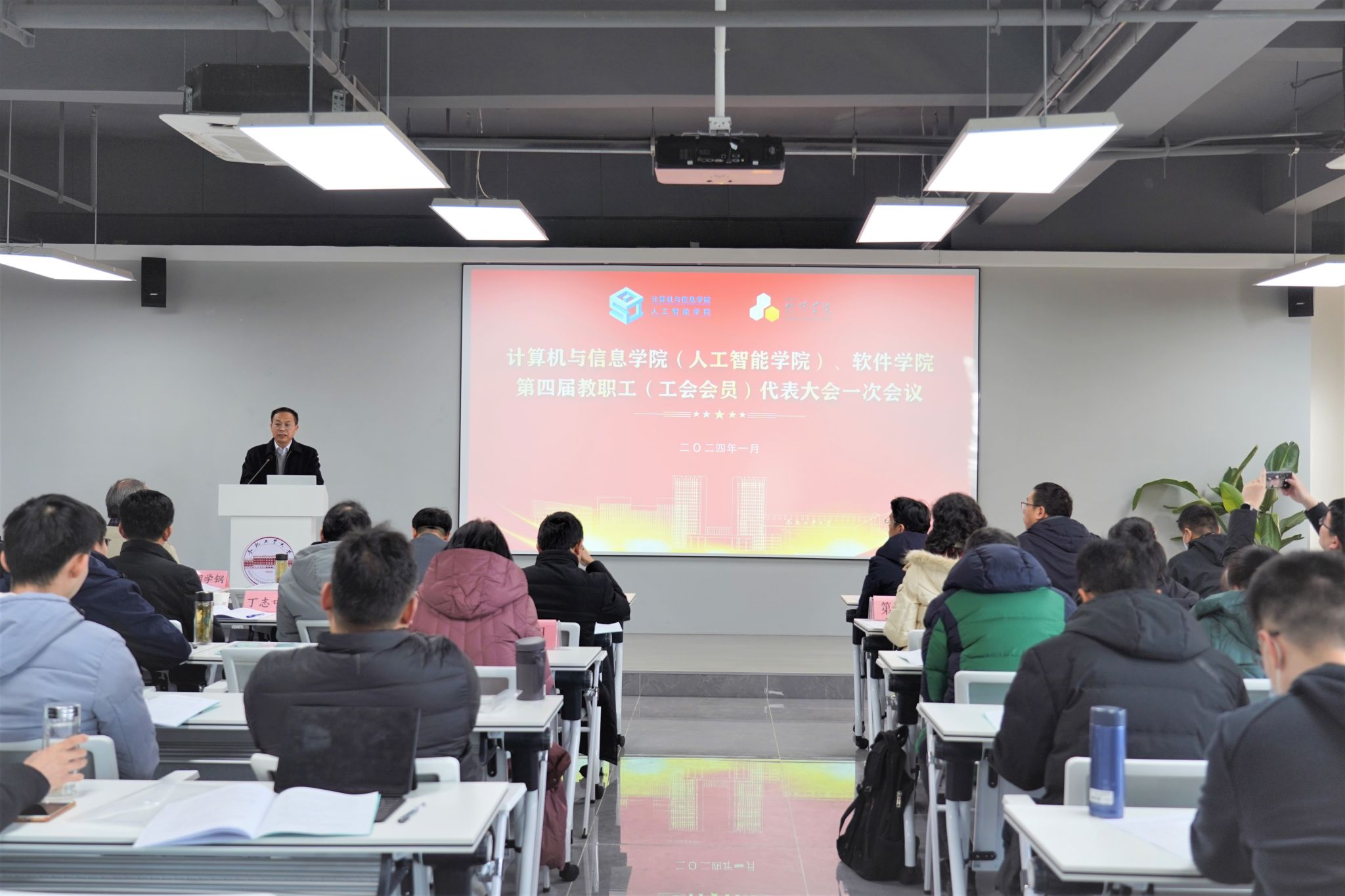(人工智能学院)、软件学院第四届教职工代表大会暨工会会员代表大会在翡翠科教楼B501报告厅隆重举行。学校工会主席胡兴祥参加会议。学院党委副书记储文静主持会议。