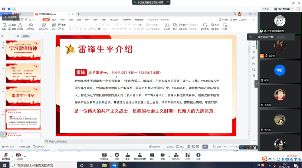 3月31日晚,党支部以线上腾讯会议形式,开展”弘扬雷锋精神,践行榜样力量”集中学习,支部全体成员参加。对于雷锋同志的先进事迹,经典语录,通过ppt、电影短片等形式展现给与会师生。会后支部成员书写下自己的感想和对“雷锋精神”的时代解读,支部将筛选优秀作品利用新媒体平台进行宣传展示。