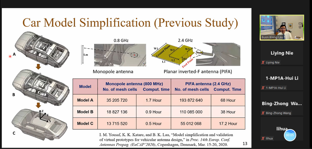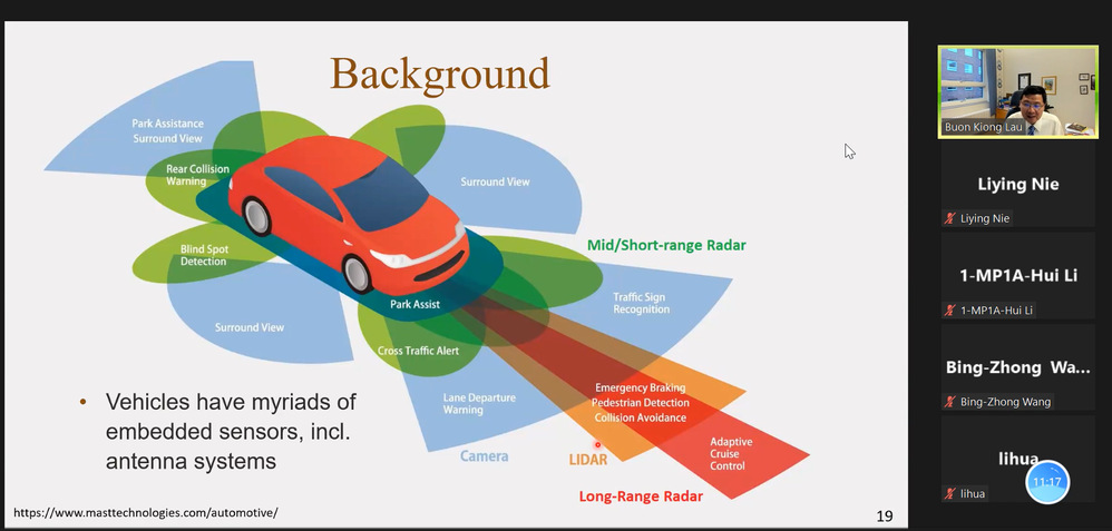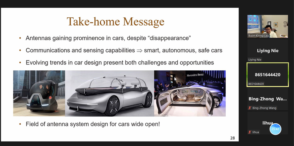 在报告会上,Lau教授从汽车天线的演进出发,对未来汽车天线的需求做出了详细的解析,并总结了汽车天线研发面临的挑战和机遇。会议中Lau教授还列举了其团队与沃尔沃合作研发的面向V2X的全玻璃车顶天线和毫米波MIMO雷达天线两款新型汽车天线,介绍了如何有效地利用特征模理论进行实际汽车天线的设计。报告结束后,线上师生与Lau教授进行了深入的交流。