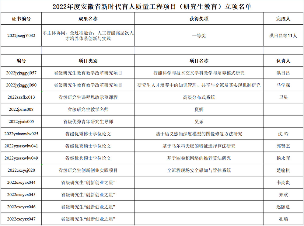近日,安徽省教育厅公布了“2022年度新时代育人质量工程项目(研究生教育)立项名单”。快看漫画 荣获安徽省研究生教学成果一等奖 1项,同时立项研究生质量工程项目 13项,详见下表。