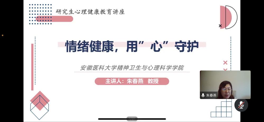 研究生会承办,安徽医科大学精神卫生与心理科学学院副院长朱春燕教授应邀担任主讲,该院学工办主任兼团委书记、研究生辅导员黄晨、研究生会学生骨干进行线下会场,近三百名研究生新生参加线上会场,讲座由研究生辅导员黄鹏飞主持。