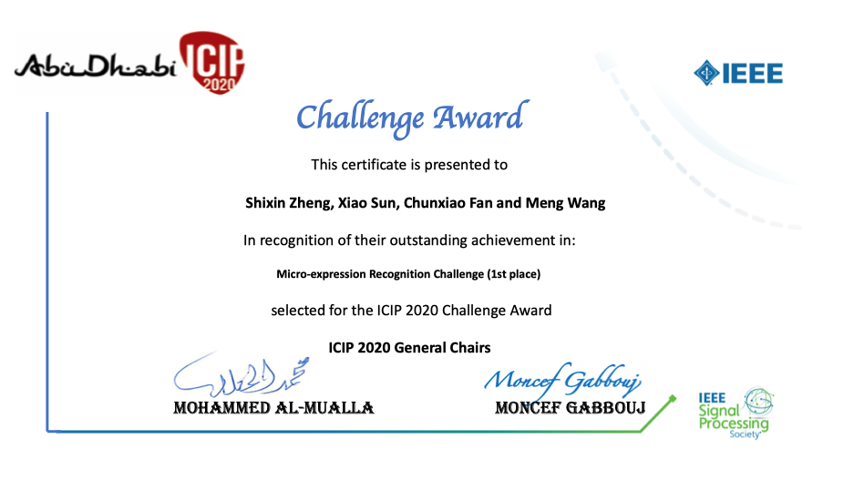 此前,由汪萌教授带队,孙晓、樊春晓等老师指导的参赛队伍还参加了国际图像处理旗舰会议ICIP 2020举办的微表情识别挑战赛,斩获冠军。参赛队伍针对微表情的复杂表征,提出了一种多策略的微表情识别模型,微表情识别精度超出第二名6.13%。