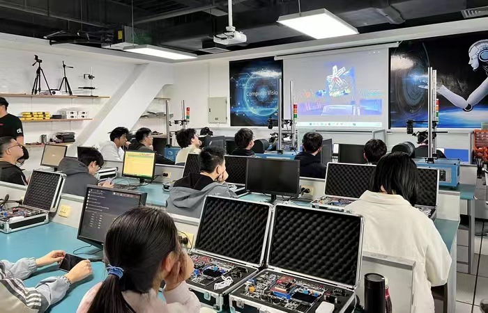 在D603机器人技术实验室,苍穹战队的成员们首先为同学们介绍了RoboMaster赛事的情况;然后介绍了苍穹战队所取得的历史成绩以及研制的多兵种机器人;随后进行了对战演示,让同学们感受了机器人技术的魅力,近距离认知了机器视觉、运动控制、结构设计等技术之美。同学们情绪高涨,现场气氛热烈。