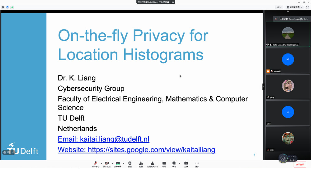 在报告会上,Liang博士介绍了其团队的最新科研成果,包括位置共享系统的背景、位置隐私问题和相关保护技术,并着重介绍了他们提出的即时隐私保护机制。Liang博士也对当前位置隐私保护的主要挑战和公开问题进行了讨论。在报告会结束后,线上师生就感兴趣的话题和Liang教授进行了深入交流。