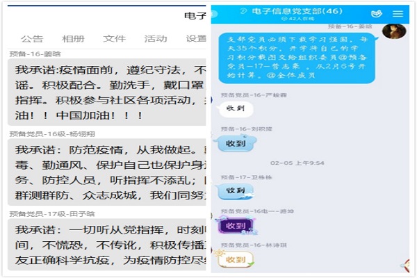 关于严肃新型冠状病毒疫情防控工作纪律的通知》要求,着重强调了作为党员要以高要求约束自己,带头执行中央部署,带头做好防控工作,带头落实学校要求,带头进行科学防控。会后支委通过党小组会向支部党员强调疫情期间的相关纪律要求。支部成员在支部群中纷纷承诺:“疫情防控期间会严格遵守纪律,积极履行党员义务,起到先锋模范作用。”
