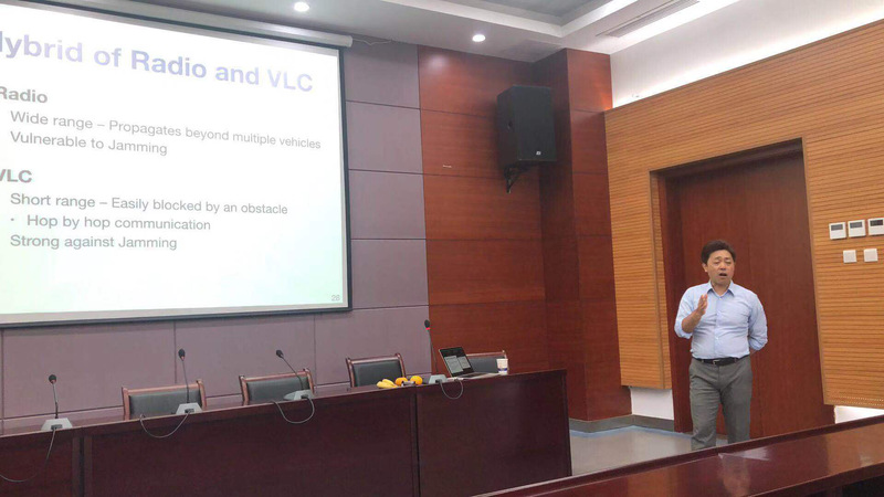 此次报告主要介绍了石原教授团队的两个关于无线自组网的项目。第一个项目是利用无线电通信和可见光通讯确保车辆的自主排列(Autonomous Platooning)。自主排列是一项很有前途的车联网通信技术,其具有降低油耗、减少交通堵塞以及通过形成火车队列的形式来提高车辆行驶途中安全性的潜力。本次报告中,石原教授主要介绍了车辆通信和自主排列的基础知识,以及利用可见光通讯来确保自主排列的模拟研究。