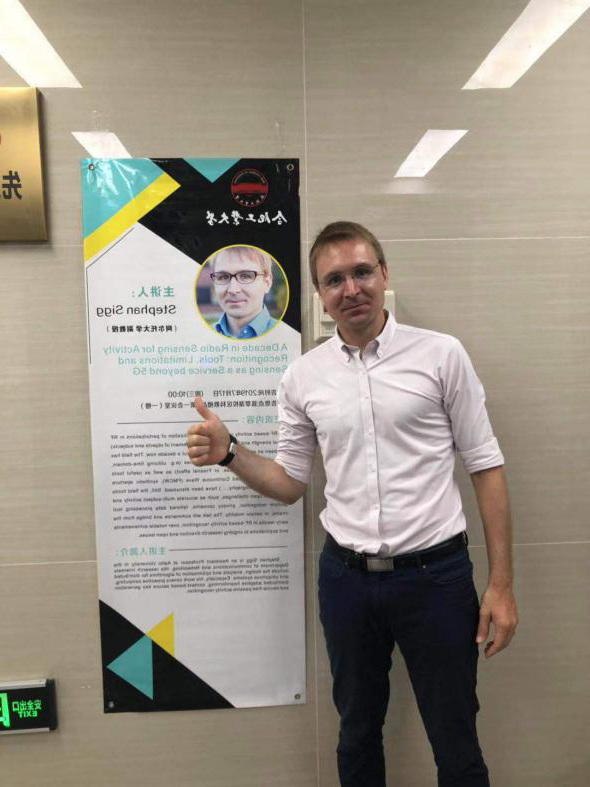 在报告会上,Stephan Sigg教授首先展示了其团队的最新研究成果——Closed-Eye Gaze Gestures,使用智能眼镜摄像头检测和识别闭眼运动。随后,Stephan Sigg教授主要介绍了该领域的一些比较成熟而多样的研究理论与研究方法(如利用频域、时域、相位和菲涅尔效应等),以及有效的工具(如调频连续波FMCW、合成孔径雷达以及全息无线电等)。并展示了其团队近些年在该方向的研究工作,如基于射频的人类动作识别、驾驶员情绪感知等。最后,Stephan Sigg教授总结了目前该领域的显著成果和应用,并对当前的主要挑战和公开问题进行了讨论。报告会结束后,在座师生就感兴趣的话题和Stephan Sigg教授进行了深入交流。