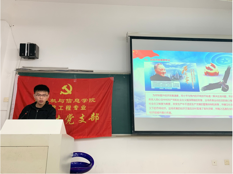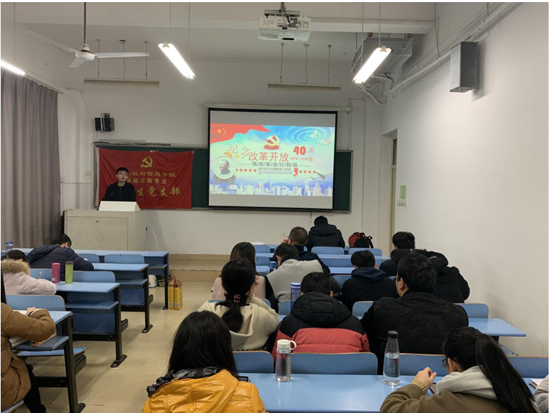 为纪念改革开放40周年,更好地领悟改革开放的精神,进一步提高党员的党性觉悟,2018年12月26日下午3点30分,通信工程专业本科生党支部在翡翠湖校区6教106教室开展主题党课学习,全体党员参加党课学习。