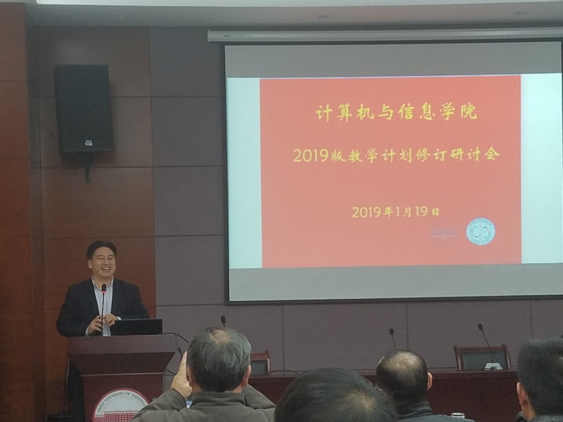 2019年寒假教学研讨会于2019年1月19日在翡翠湖校区翡翠科教楼A座第五会议室成功召开。针对学校启动制定2019版本科专业人才培养方案的工作,为了持续深化“立德树人、能力导向、创新创业”的教育教学体系改革与实施,对标新工科和专业评估认证,适应新时期教学要求,此次研讨会的主要内容是学院各个专业的2019版教学计划的修订。学校创新创业中心主任黄景荣、学院党委副书记年永琪、学院教学副院长杨学志、学院教学指导委员会所有成员、各个系、所、中心和专业负责人、课程组和课程群负责人以及学工系统代表出席了本次会议。此外,学院还邀请了兴业银行合肥分行、科大国创软件股份有限公司、中国电科38所、中国电信安徽公司物联网中心、中新网络安全股份有限公司等企业界的代表出席了本次会议。