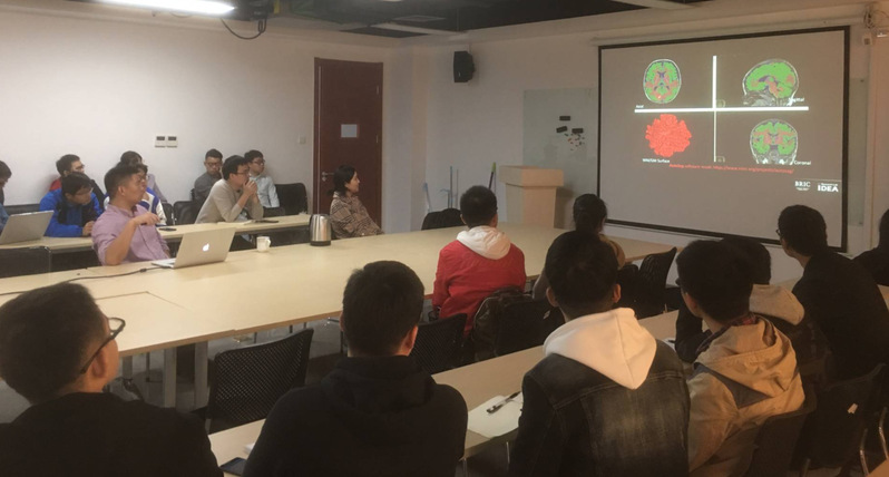 王利博士首先介绍了IDEA实验室参与的“婴幼儿脑功能分析”国际项目背景,以及婴幼儿脑疾病早期诊断的重大科学价值和社会意义。王利博士进而展示了婴幼儿脑在发育过程中影像模式随之变化的难点,并详细介绍了近年来他所研发图像处理技术在攻克该难点所取得的系列成果,包括婴幼儿脑组织精细化分割算法、婴幼儿脑区自动划分、婴幼儿脑结构发育和自闭症倾向关联等。本次报告吸引了在座本科生和研究生极大兴趣。在问答环节,王利博士分别就婴幼儿脑结构和功能发育背景知识、相关研究前沿动态、未来研究展望等方面向在座师生做出了详细的解答。