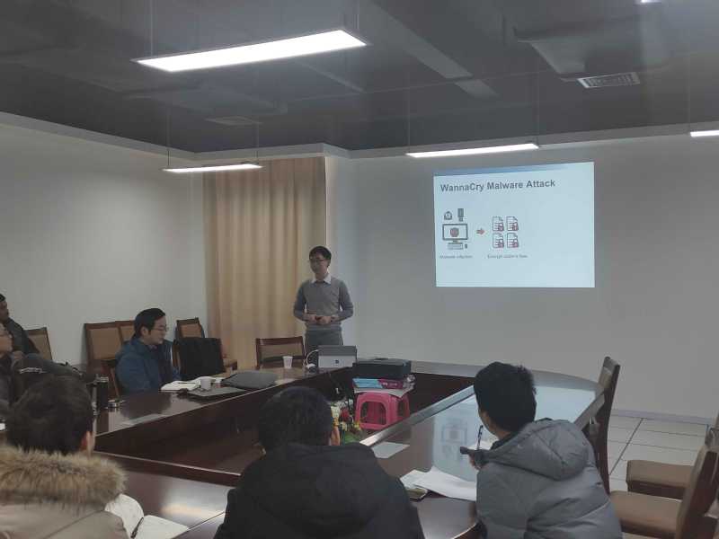 徐东鹏博士首先通过勒索病毒简要说明了恶意软件已经对现代计算机安全构成了严重的威胁。恶意软件的作者们采用了加密算法和程序混淆技术来实现他们的目的,例如: 隐藏恶意代码的行为,伪装具有破坏性功能的程序片段,绕过防火墙等等。现代的勒索软件还可以将用户的数据加密,然后向用户索取赎金。因此,高效的恶意软件分析技术在计算机安全防护领域是必不可少的。在这个报告中,徐东鹏博士展示了二进制程序分析技术在恶意软件防护方向的最新研究进展,重点介绍了一种新型的可以在被混淆后的程序中检测加密算法的方法。这一方法可以精确地在勒索软件、木马病毒等恶意软件中识别加密算法。并且还简要介绍动态二进制代码分析技术在其他安全领域的应用,例如软件混淆和相似度检测。最后展望了动态程序分析技术在信息安全领域的未来趋势。报告会结束后,在座师生就感兴趣的话题和徐博士进行了深入交流。