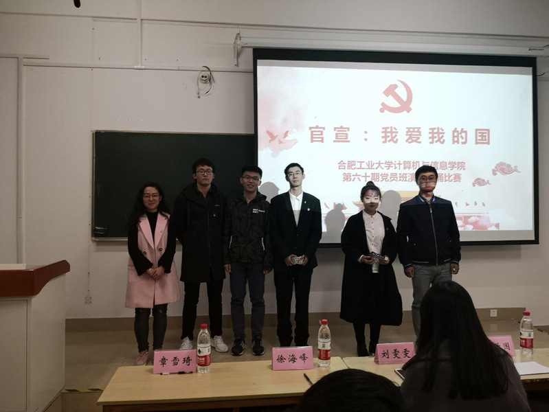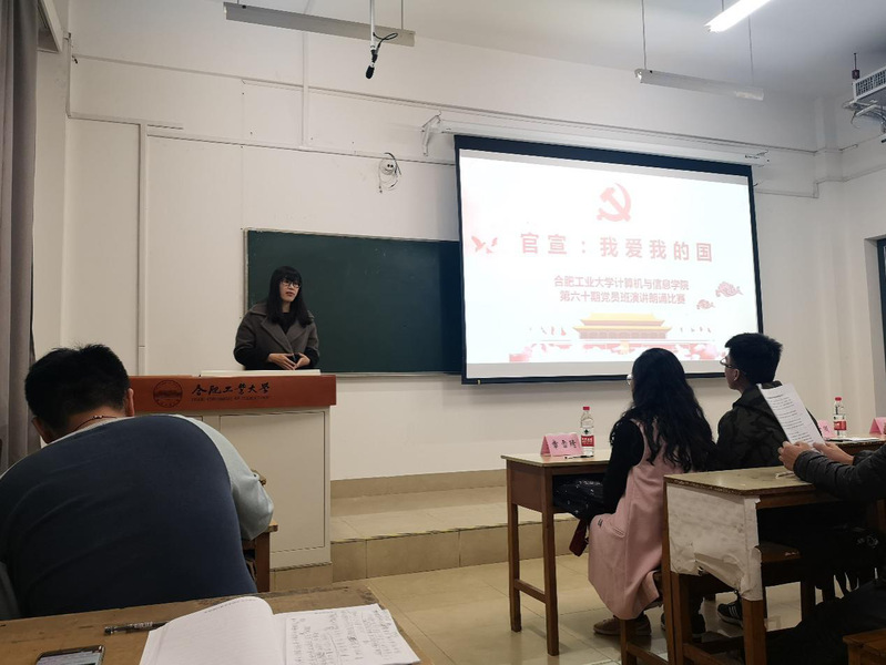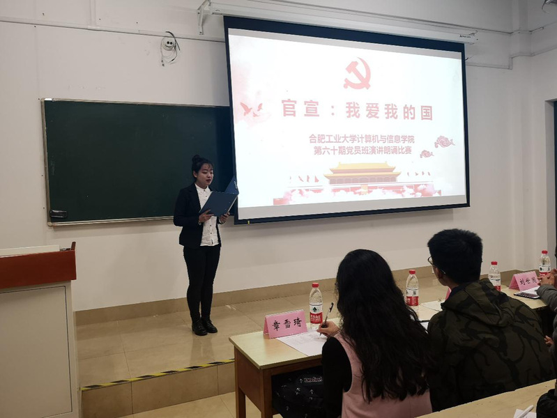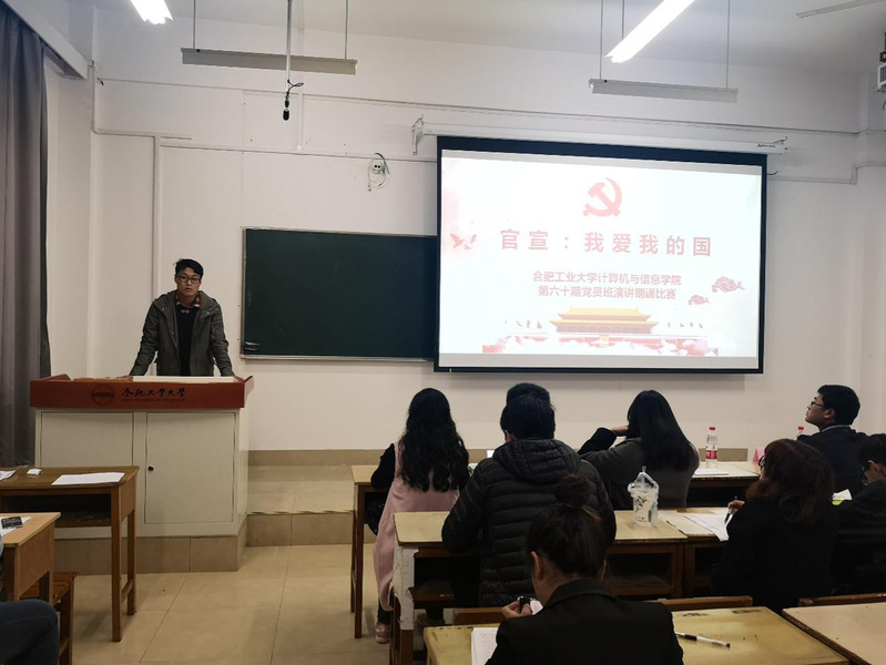 第60期党员班于2018年11月11日晚七点在翡翠湖校区3教309举办主题为“官宣,我爱我的国”朗诵演讲比赛。学院相关负责老师以及各专业党支部副书记等出席并担任评委,党员班55位成员参加本次活动。