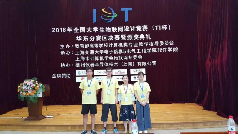 队伍共获得特等奖两项、一等奖一项,获得特等奖的队伍将代表华东赛区参加9月15号至16号在无锡举办的2018年世界物联网博览会暨全国总决赛。其中李佳、乔轩元、何海涛、张乾威同学的作品《基于“深度学习”的交通违章智能追溯系统》(指导老师:卫星、陆阳)获大赛特等奖,梁承炜、鲁東、王九杭同学的作品《校园雨伞寄存共享一体化智能系统》(指导老师:李春华、周波)获大赛特等奖;王俊达、储琦、王雯云的《基于隐式感知的认知下降预警系统》(指导老师:杨矫云、吴玺)获大赛一等奖。