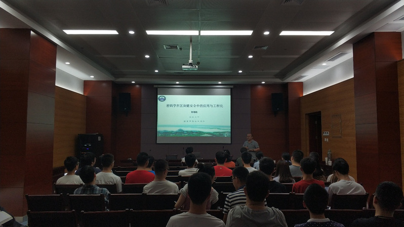 邀请,武汉大学国家网络安全学院何德彪教授和苏州链原信息科技有限公司郭宇 CEO做了区块链专题报告。网络与信息安全研究所所长胡东辉主持了报告会。来自学院多个系所的师生、部分外院师生参加了此次报告会。