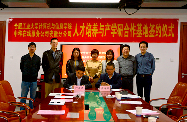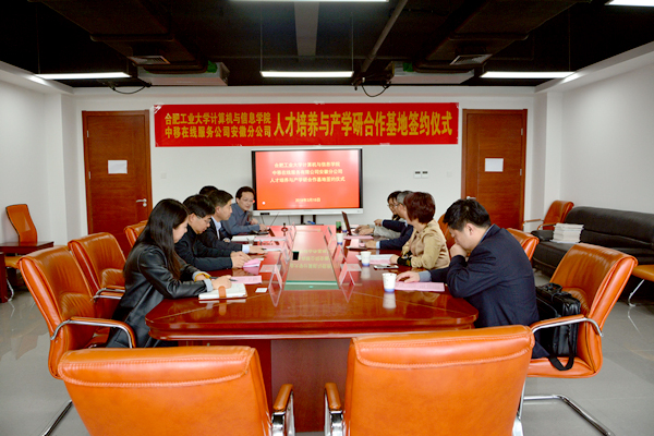 与中移在线服务有限公司安徽分公司产学研合作签约仪式在翡翠科教楼A1106举行。中移在线服务公司安徽分公司总经理黄海军、副总经理刘晓梅、人力资源部经理柯晓岚、系统支撑团队主管万鹏、快看漫画