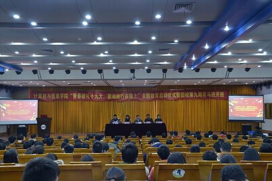 在翡翠湖校区图书馆报告厅举办“青春献礼十九大,聚魂励行在路上”主题教育启动仪式暨团校第九期马克思主义者培养工程培训班开班,相关领导和老师、学院全体学生党员及本期青马班学员出席本次启动仪式。