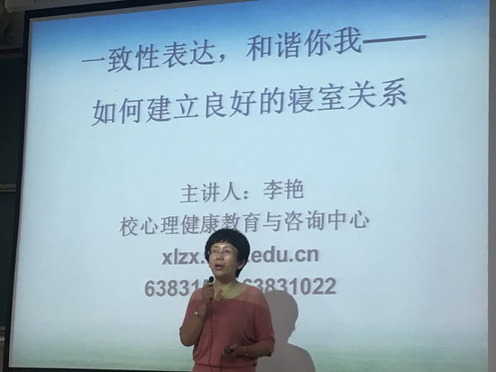 随后,校心理咨询中心老师李艳为全体营员做《一致性表达,和谐你我——如何建立良好的寝室关系?》的培训讲座,讲座以萨提亚沟通模式为中心,从识别沟通姿态和一致性表达两个方面,生动具体地帮助同学们认识和理解萨提亚模式中的5种沟通姿态,并指出大家应该向表里一致型的方向努力,这种类型表现出一种内在的觉察,表情流露和言语一致,内心和谐平衡,达到自我、他人和情境三者的和谐互动,有助于我们建立和谐健康的寝室人际关系。除此之外,活动现场还进行了多次互动环节,赢得了同学们的阵阵掌声与喝彩,将讲座的氛围一次又一次推向了高潮,在座同学们都受益匪浅。