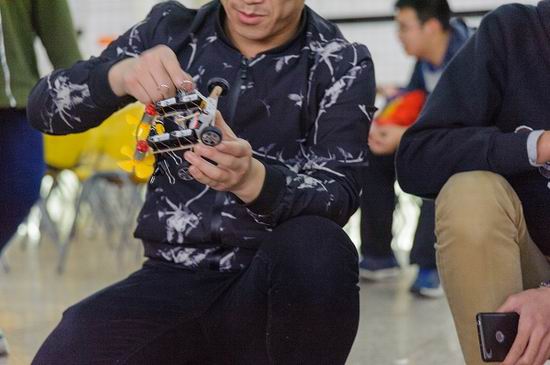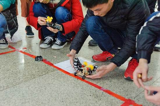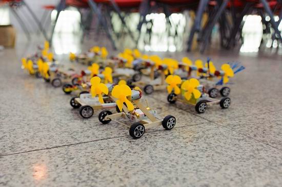 风驱车设计大赛要求选手们使用统一提供的材料制作风力驱动的小车进行多项测试,相同的材料,不同的创意,本次比赛以其新奇的比赛形式成功博得众人眼球,引来了众多学院学生的积极参与。比赛当天二十余组选手携带自己的“赛车”前来一决高下,经过测速,负重等项目的激烈角逐终于产生了冠亚季军。来自第19组侯邦苧、钱伟昕、韩生兴三位选手制作的小车以绝对的优势赢得冠军荣誉,其小车令人惊奇的速度赢得现场人员的阵阵惊叹。本次比赛优秀作品也在科技节中进行了展示,工作人员邀请现场观众进行投票互动,选出最佳创意小车,观众也给予了热烈响应。
