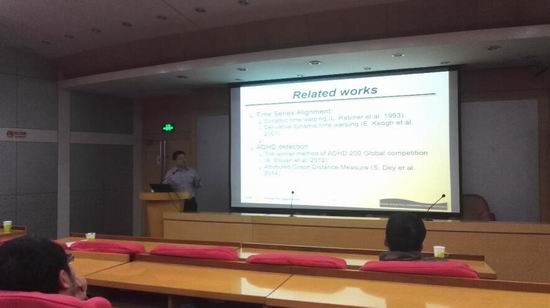 齐博士首先由神经科学中脑成像技术方面的巨大进步引出此次报告的主要内容,介绍了利用功能磁共振成像技术(fMRI)间接测量神经活动的变化可以及时观察和诊断注意力缺陷多动症(ADHD)。齐博士进而详细地阐述了基于时间序列的First-Take-All(FTA)哈希算法,利用FTA哈希编码检测健康的人与ADHD患者之间fMRI time-courses的异同来进行ADHD的诊断。这场报告讲座让在座的老师和同学们受益匪浅,多位同学和老师就自己的研究方向与齐博士展开了深入的探讨。