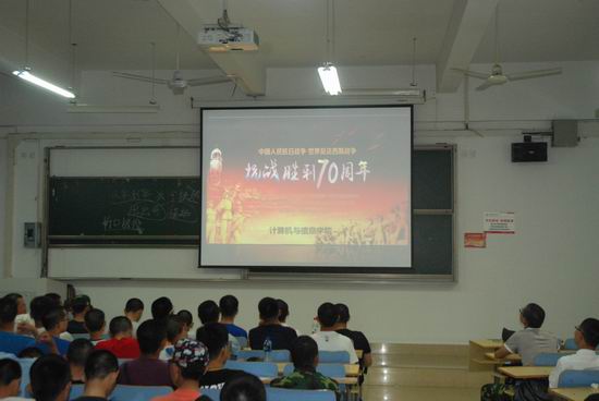 团总支特邀军事爱好者协会的会长谢海生学长为2015级新生做主题为“纪念抗战胜利70周年”的专题报告会。报告会上,谢海生学长通过ppt展示与互动相结合的形式,带领2015级新生一同回顾了抗日战争的伟大历程,并深入剖析了战争对人类社会发展的危害,传达了远离战争,珍视和平的价值观念。