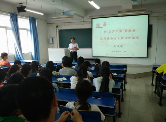 党课的题目为:用“三严三实”的标准践行社会主义核心价值观。何庆领同志从社会主义核心价值观提出的背景、与西方普世价值观的区别以及培育社会主义核心价值观的意义等方面讲到青年大学生正处于人生观、价值观形成的关键时期,思想观念趋于成型,但仍具有较大的可塑性;接受新鲜事物的能力很强,但鉴别力明缺。赢得青年就赢得未来,以社会主义核心价值观加强大学生党员教育,具有鲜明的时代意义和现实意义。