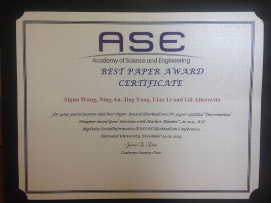 在 2014年12月14-16日于哈佛大学举办的Academy of Science and Engineering(ASE)2014年生物医疗计算国际会议(2014 ASE International Conference on Biomedical Computing,BioMedCom 2014)上,国家“111计划”老人福祉信息科技创新引智基地博士生王爱国同学喜获会议的最佳论文奖(Best Paper Award)。