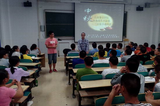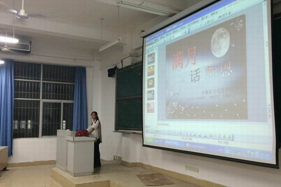 “满月话师恩”双节主题班会在翡翠湖校区举行。学院2014级全体新生参加了班会。班会由学院辅导员宋燕老师、石楠老师分别主持。