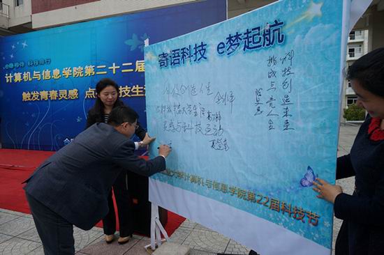 本次科技节在“e路相伴,科技同行”的大背景下,以“触发青春灵感,点亮科技生活”为主题,从4月13日开幕式至5月31日闭幕式,历时一个半月,在此期间,将举办囊括参观体验类、比赛竞技类、科技服务类共计11余项活动,举办科技讲座共计10余场,全面提升广大同学的科技素养与动手实践能力。开幕式上,合肥市科协主席金维平致辞,在充分肯定了科技节的内涵的基础上,鼓励同学们积极参与到科技创新、科技实践当中去,努力提升自己的科学素养与创新能力,并预祝本次科技节取得圆满成功。随后,校团委书记陈文恩指出:自主创新能力成为国家竞争力的核心,培养学生科技创新素质是学校人才培养目标的重要内容,我们要认真总结经验,不断开拓创新,坚持不懈地办好一年一度的大学生科技文化节。希望同学们能够借助科技节这个平台,善于思考、勇于创新、不断进取,更好地投入到专业学习和科技创新工作中,促进资源整合,展示先进科技,推动科技创新。学院科技与创新协会主席吴晶晶详细介绍了此次科技节的相关情况。最后,嘉宾寄语科技节并合影留念。