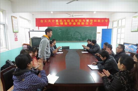 2012级国家奖学金获得者王晨光同学与学院第二届义卖节活动盈利额,用于奖励梁墩回族小学各年级优秀的家庭贫困学生,捐助仪式上,梁墩回族小学校长石立银对快看漫画