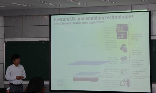 汪孔桥研究员首先从工业界视角分析了当前智能移动设备行业的发展格局;指出人机交互技术在其中的重要价值,进而探讨了这一领域内的研究热点、未来走向和技术挑战;并通过算法简介和视频演示,介绍了他所领导团队在基于手势识别的智能移动设备上所取得的最新进展。报告结束之后,在座师生就技术细节、行业发展等方面提出了问题,汪孔桥研究员分别作了耐心细致的解答。报告会在热烈的掌声中结束。
