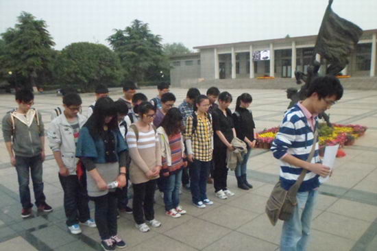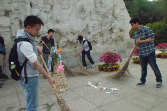 学员们在认真的聆听了讲解员关于革命先烈英雄事迹的讲解后,纷纷主动拿起扫帚为烈士陵园进行清洁打扫,获得了在场市民的称赞。纪念墓碑下,在本次青马班班长马闯同学宣读题为“纪念革命烈士、认识时代使命、为雅安地震哀悼”默哀词后,学员们怀着沉重的心情为雅安地震中遇难的同胞默哀。