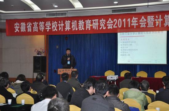 副院长王一宾教授作“普通高校IT‘卓越工程师’人才培养计划”报告,巢湖学院计算机与信息工程学院院长郑尚志教授作“安徽省计算机基础竞赛设想” 报告,安徽电子信息职业技术学院计算机系主任王韦伟教授作“中央财政支持高等职业学校提升专业服务能力项目建设情况介绍”报告。