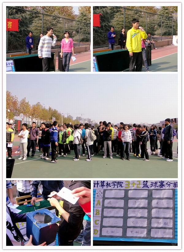 第五届“3+2”篮球赛开幕。接下来是各个班级为自己助威的环节,各班运动员在本班体委的带领下喊出了属于他们自己的口号,口号声此起彼伏,震耳欲聋。最后,由各班体委参加抽签环节,对参加本次篮球赛的12个班级进行分组。