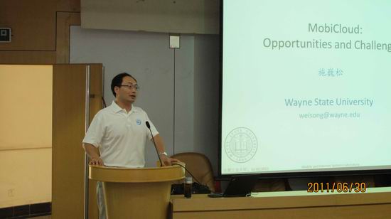 邀请,由系统结构研究所安排,美国伟恩州立大学计算机科学系施巍松教授在校学术会议中心二楼报告厅做题为“MobiCloud:Opportunities and Challenges”的报告。刘晓平院长、蒋建国书记、郑利平副院长以及计算机系、所负责人、相关教师和学生聆听了报告。报告由刘晓平院长主持。