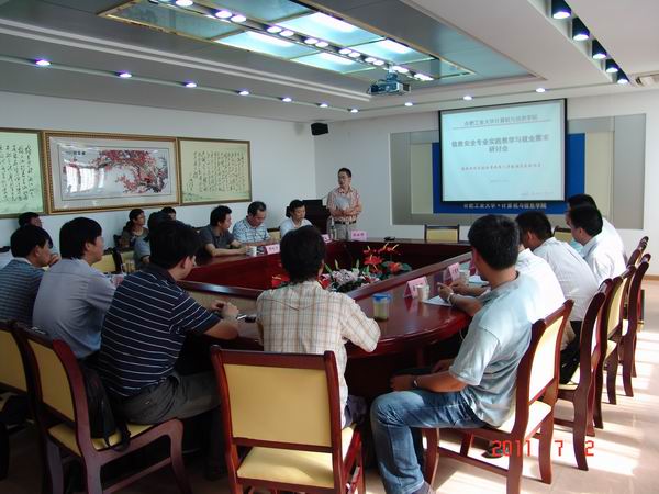 在上午研讨会上,蒋建国书记、郑利平副院、胡学刚主任分别致辞和发言。网络信息安全研究所侯整风教授介绍了信息安全专业发展情况,并分析了近年来的就业情况。胡东辉所长介绍了网络与信息安全研究所的科研现状、2011版信息安全本科专业教学计划整体情况和课程群设置。朱晓玲、丁凉、胡东辉老师(替张仁斌老师)分别汇报了密码学课程群、网络安全课程群、软件安全课程群及实践教学内容。安徽省国家保密局检查处和安徽省国家安全厅计通处的相关领导分别就安全保密单位的职能要求和工作特性介绍了安全保密单位对信息安全专业毕业生的素质要求,并提出很多有益的建议。在下午研讨会上,北京西普科技公司的林雪纲技术总监、(北京)网御神州公司的李震技术总监、上海卫士通公司吕明忠技术总监、合肥龙旭网络技术有限公司岳文超总经理分别做报告,介绍了各个公司的科研情况,以及企业需要信息安全毕业生所具备的知识、技能和其他素养,并给出中肯、具体的建议。信息安全本科专业的两位同学在众多公司老总、技术总监的面前展示了他们的网络攻防实验作品。座谈会后,北京西普科技公司、合肥龙旭网络公司就共建实践教学示范基地协议签字,计算机学院副院长郑利平、网络与信息安全研究所所长胡东辉及相关公司技术总监参加了签字仪式。