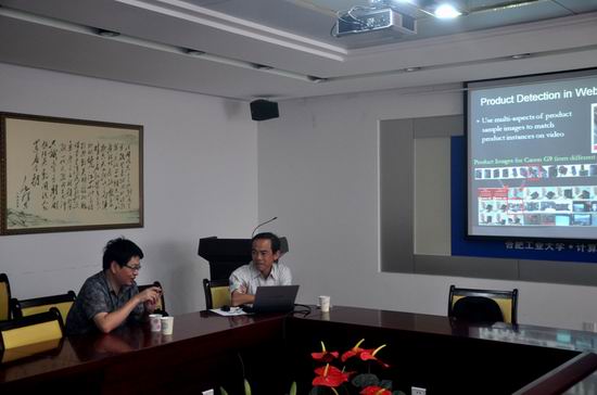 蔡达成教授介绍了多媒体问答系统的研究背景,多媒体问答系统的研究进展和对于多媒体问答研究的展望。蔡达成教授的报告新颖,所做报告对于从事互联网应用研究的广大教师、研究生带来很好的启迪和指导,使广大师生受益匪浅。8月13日下午,出差刚回到合肥的徐枞巍校长亲切会见了蔡教授一行,商讨了共建网络多媒体检索研究基地、学术交流与互访等共同关心的问题。