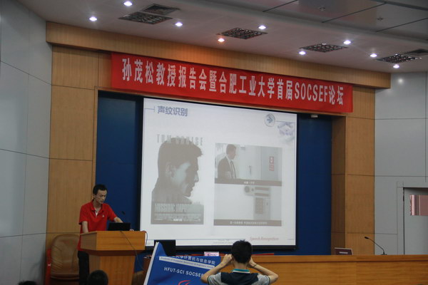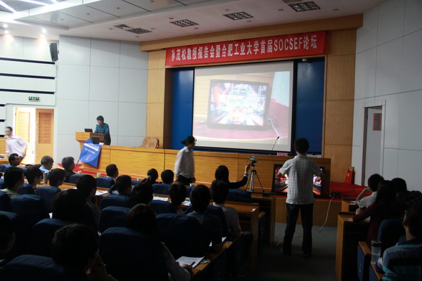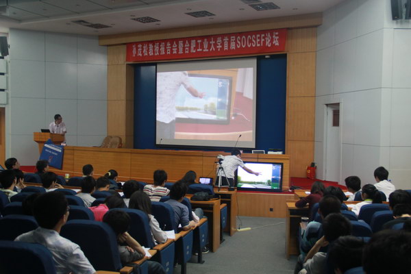 紧接着,论坛围绕“自然人机交互技术——谁主沉浮”主题进行,计算机08级1班班长吴佳欢主持了论坛,体感交互小组、语音交互小组、视频处理交互小组、多点触摸交互小组进行四个主题报告。报告中,体感交互组以kinect为出发点,对体感交互技术的原理、发展、实现、应用进行详细的介绍,并在现场进行kinect应用演示,最后勾勒了他们对体感交互的未来的完美构想。语音交互组从智能家居入篇,精彩纷呈的讲解了人类未来用最自然、最便捷、最普遍的语音来控制生活的点点滴滴、分分秒秒。视频处理组将当今智能生活用一个小小的摄像头展示给每一位与会人员,博得阵阵掌声!多点触摸组则在现场用机器演示模拟多点触摸游戏和互动,带我们一步步走进人类未来生活充满多点触摸的世界中。报告结束部分,各位与会嘉宾对首期SOCSEF的获奖小组进行颁奖,论坛圆满结束!