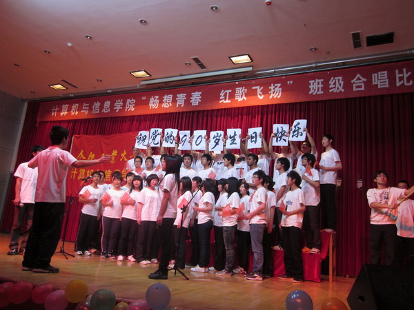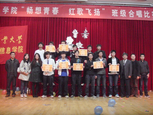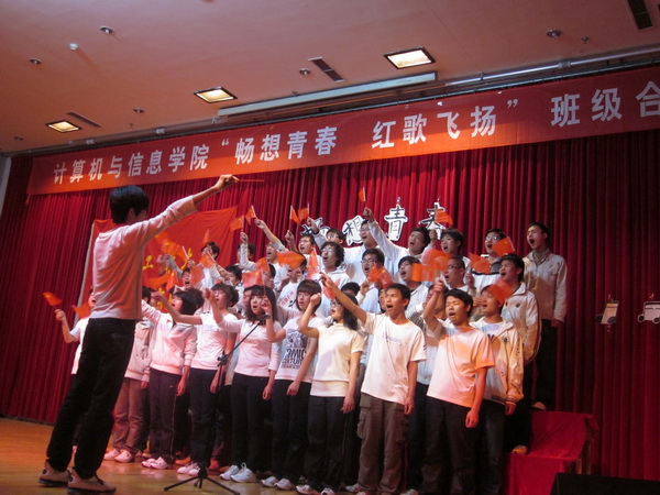 学院的Coolist乐队以一首《国际歌》拉开了合唱比赛的序幕。之后,来自10级的13个班级同学们带着高昂的激情演唱了《歌唱祖国》、《红旗飘飘》、《我的中国心》、《精忠报国》等26首爱国歌曲,他们用自己嘹亮的歌声诠释了对祖国、对党、对母校的无限热爱和深深眷恋,展现出青年学子团结奋发、朝气蓬勃的精神面貌。