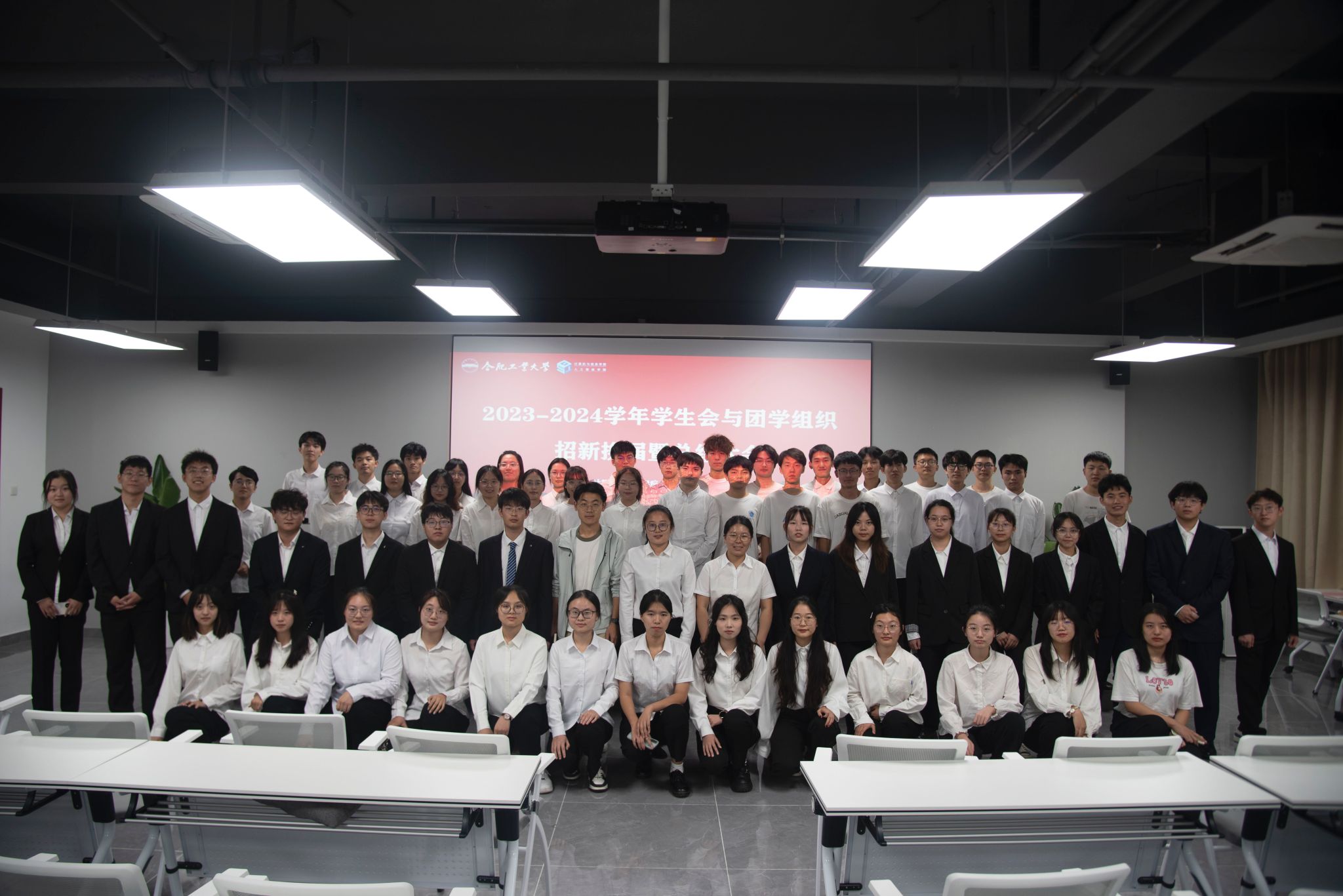 在翡翠科教楼B座501举行2023-2024学年学生会与团学组织招新换届暨总结大会,学院相关负责老师与全体学生会与团学组织成员参与。