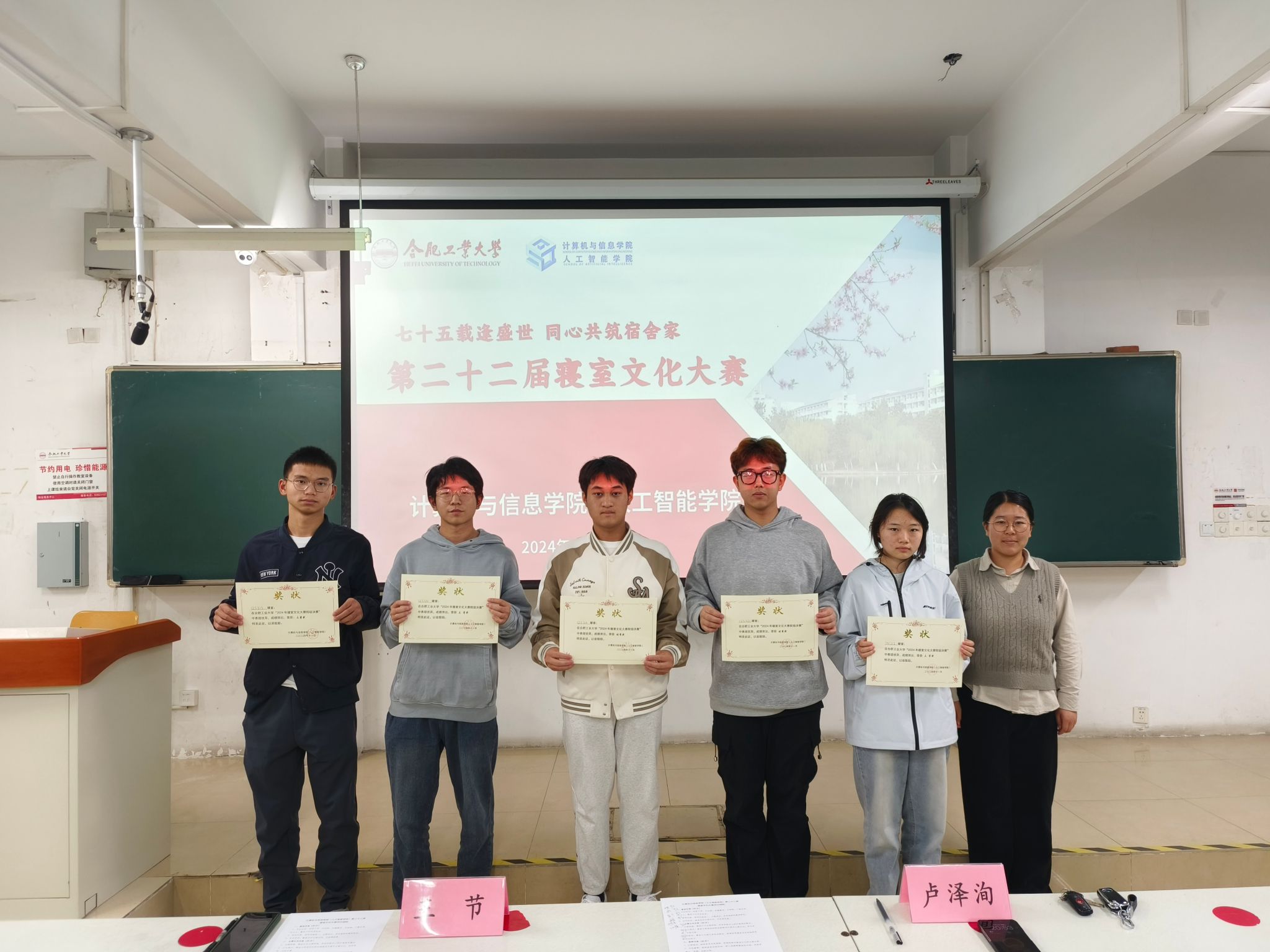 (人工智能学院)在翡翠湖校区7教205教室开展了“七十五载逢盛世,同心共筑宿舍家”第二十二届寝室文化大赛。2024级辅导员卢泽洵、王节、2023级团学组织学生代表以及2024级学生参加本次活动。
