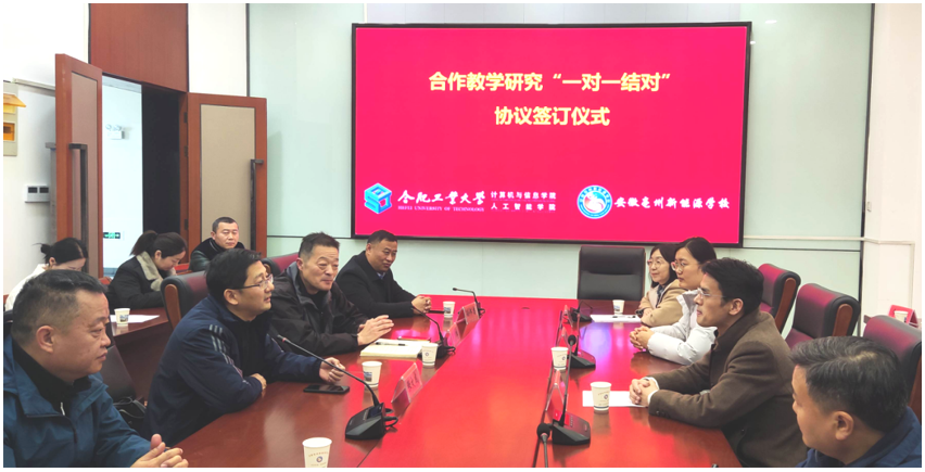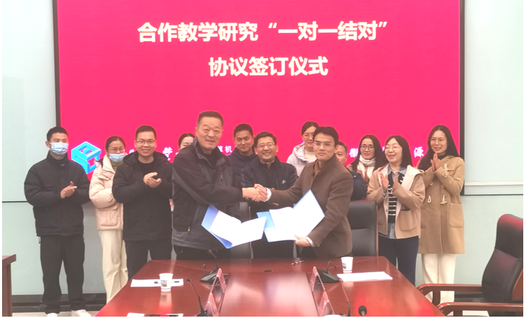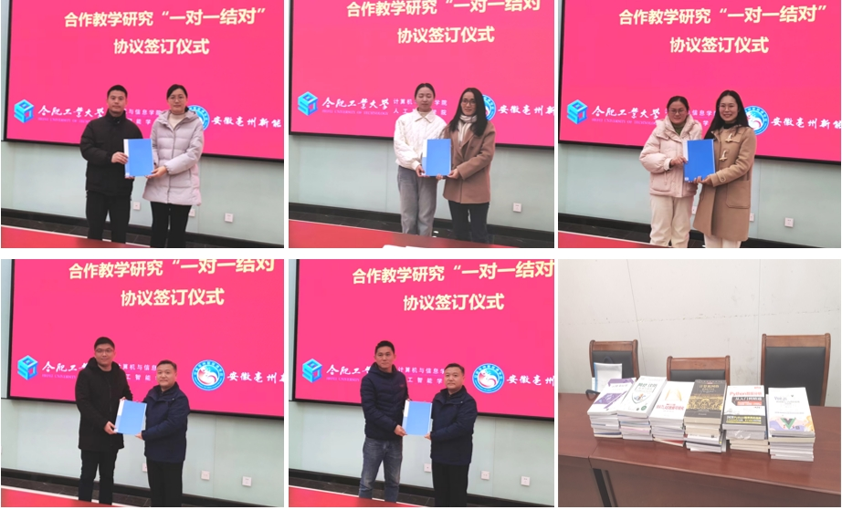 与新能源学校进行了合作教学研究“一对一结对”签约仪式。现场,双方学校的5对教师“牵手”成功(图3),他们将在接下来的6个月里,合作开展教学、科学研究,形成一定的研究成果,并进行成果的合作发表,另外,我方教师还将协助对方进行学历提升的各项准备工作,包括考研的复习和备考。仪式最后,还进行了计算机类优秀图书的捐赠。