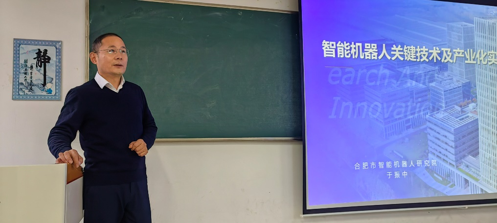 为进一步推进产教融合,帮助本科生深入了解智能机器人前沿技术及其应用场景,2024年12月9日下午,信息与通信系邀请了合肥市智能机器人研究院于振中研究员,在翡翠湖校区为通信工程专业的本科生带来了一场题为《智能机器人关键技术及其产业化》的产业课程。