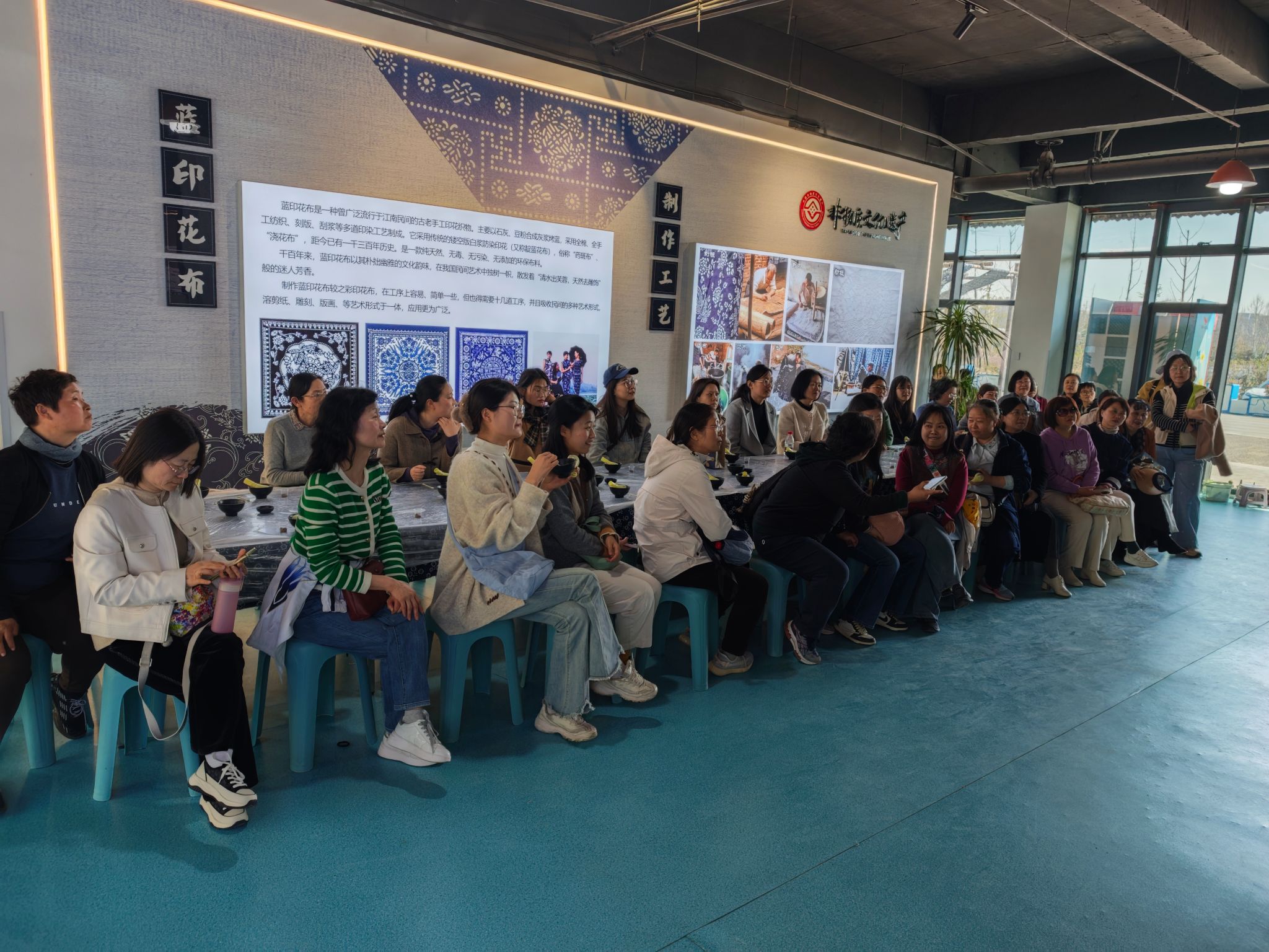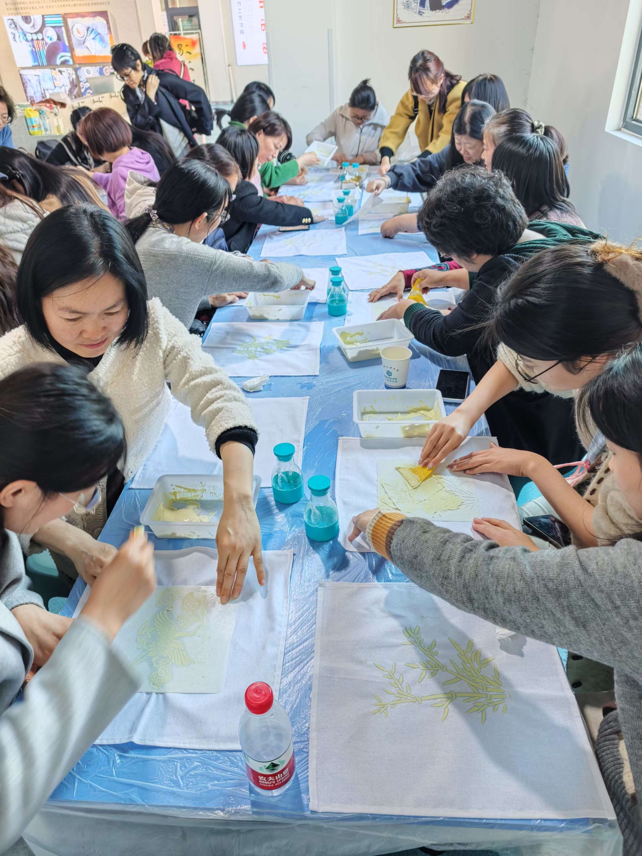 点茶之后,女教职工们转战古法扎染工坊。扎染是中国传统的手工染色技艺,通过和粉、涂抹图案,再进行染色,形成独特的视觉效果。在扎染老师的指导下,大家发挥创意,先将粉末以水搅匀,再将水浆均匀抹面在布上,拓出图案,接着将布料浸入染缸,再展开时,一幅幅蓝白碰撞、图案各异的布艺作品呈现在眼前,等晒干后,图案便会成型。