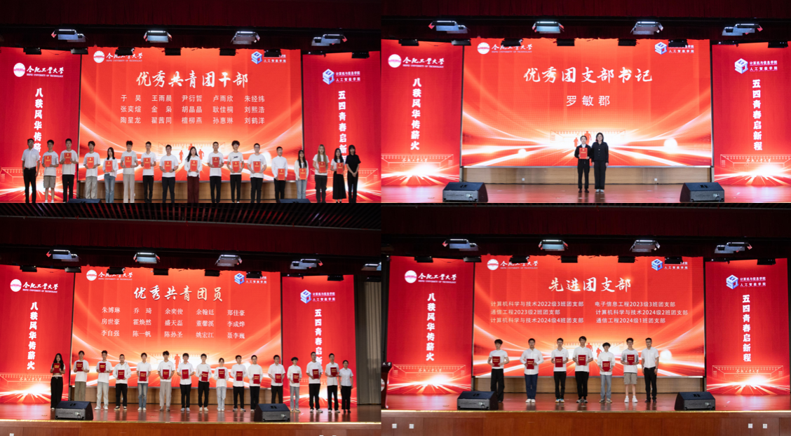 大会在庄严的团歌声中拉开序幕,熟悉的旋律瞬间点燃了现场的青春激情,让大家更加深刻地感受到五四精神的磅礴力量。张海林代表学院向受表彰的先进集体和先进个人表示热烈的祝贺。肯定了过去一年,学院共青团工作在学校团委领导下,在思想引领、凝聚力量、筑梦青春、文化传承等方面取得的显著成效。他向全体青年学生提出四点希望:一是坚定理想信念,厚植家国情怀,做新时代的“追光者”,把对祖国血浓于水、与人民同呼吸共命运的情感贯穿学业全过程、融汇在事业追求中;二是投身科技创新,勇攀科技高峰,做新时代的 “拓荒者”,要抢抓机遇,主动参与 “人工智能 +” 行动,在大模型创新、核心技术研发等领域贡献青春智慧;三是传承优秀文化,增强文化自信,做新时代的 “传承者”,要积极参与文化传承创新实践,在非遗保护、文化创意、国际传播等领域展现作为;四是发扬奋斗精神,投身社会实践,做新时代的 “实干者”,要积极参与乡村振兴、生态保护、基层治理等国家战略,到艰苦环境中磨砺品格,锻炼成长。学院团委副书记叶璟宣读了《关于表彰 2024-2025 学年学院共青团工作先进集体和先进个人的决定》的表彰文件。与会老师为2024-2025学年校级五四红旗团支部、优秀团支部书记、先进团支部、优秀共青团干部、优秀共青团员等先进集体与个人代表颁发了荣誉证书。颁奖典礼后,荣获“校优秀团支部书记”称号的计算机科学与技术2022级3班罗敏郡同学以“青春心向党,计科创未来”为题,从“心路启航,思想引领”“心创未来,创新创业”“心行融通,知行合一”三个方面分享了班级团支部建设经验。通信工程2022级1班学生代表翟茜同作交流发言。