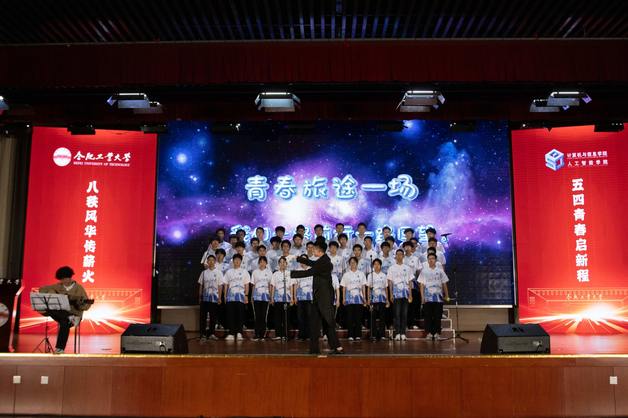 班级风采展中,电子信息工程2024级1班带来的《倔强》,同学们用坚定有力的歌声表达了青年不惧困难、勇往直前的决心;计算机科学与技术2024级3班的《起风了》,旋律悠扬,唱出了青春的懵懂与成长;信息安全2024级1班的《上春山》充满活力,展现出对未来的美好向往。通信工程2024级2班的《黄河大合唱》气势恢宏,同学们以饱满的热情、激昂的歌声,再现了那段波澜壮阔的历史,唱出了中华儿女的英勇无畏,赢得了现场观众的阵阵掌声。通信工程2024级1班的《向阳而生》以温暖声线传递心向阳光、无畏成长的信念,恰似通信信号穿越风雨连接世界的力量;计算机科学与技术2024级4班的《平凡之路》在代码的世界里诠释平凡坚守,用歌声诉说每一次程序运行都是科技大厦的基石;计算机科学与技术2024级1班的《稻香》于温柔旋律中种下乡愁,提醒逐梦路上不忘编程初心的纯粹美好;计算机科学与技术2024级2班的《你从未离去》深情致敬传承,让前人智慧在技术迭代中继续温暖创新之路;电子信息工程2024级2班的《最初的梦想》高唱初心不改,在电路板的焊点间重拾对电子技术的热忱与执着;电子信息工程2024级3班的《勋章》用激昂节奏镌刻奋斗印记,将每一次实验攻克化作成长路上的闪耀勋章。每个班级都用独特的方式诠释着对歌曲的理解,展现出班级的凝聚力和同学们的青春风采。