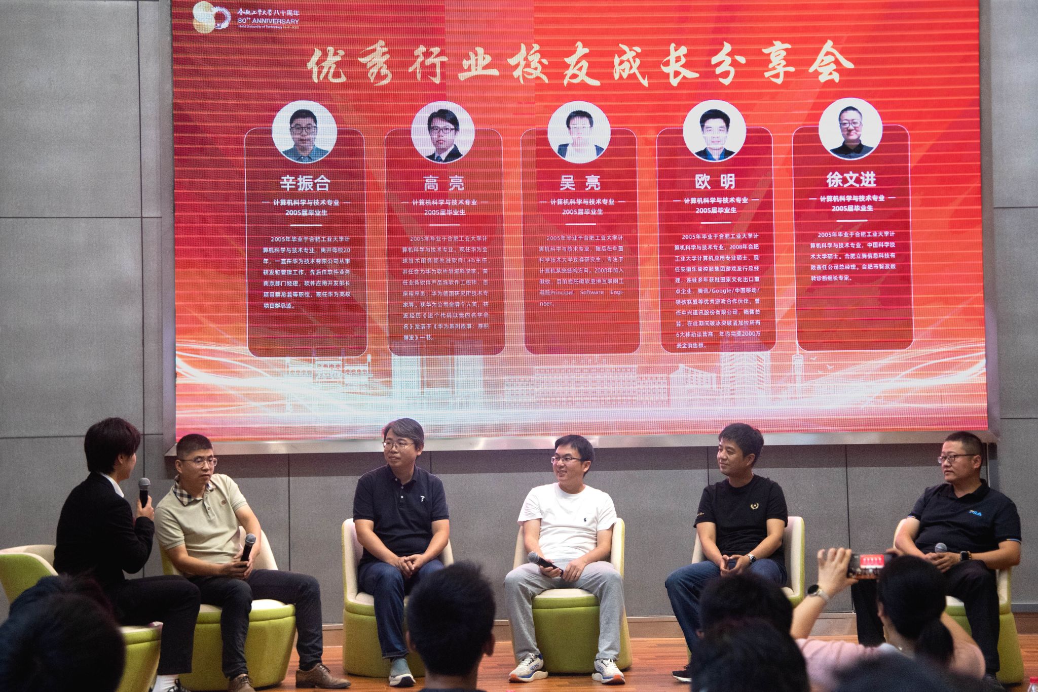 八秩薪传,熠熠生辉。值此喜迎建校80周年华诞之际,9月20日,学院成功举办“面对面 忆往昔 绘新图——优秀行业校友分享会”。活动特邀华为技术有限公司高级项目群总监辛振合、华为全球技术服务部先进软件Lab主任高亮、微软亚洲互联网工程院首席软件工程师吴亮、安徽乐堂控股集团游戏发行总经理欧明、合肥立腾信息科技有限责任公司总经理徐文进五位优秀校友重返母校。学院党委书记年永琪、教学副院长李培培与近百名师生共同参与活动。本次活动由学院副院长王辉主持。