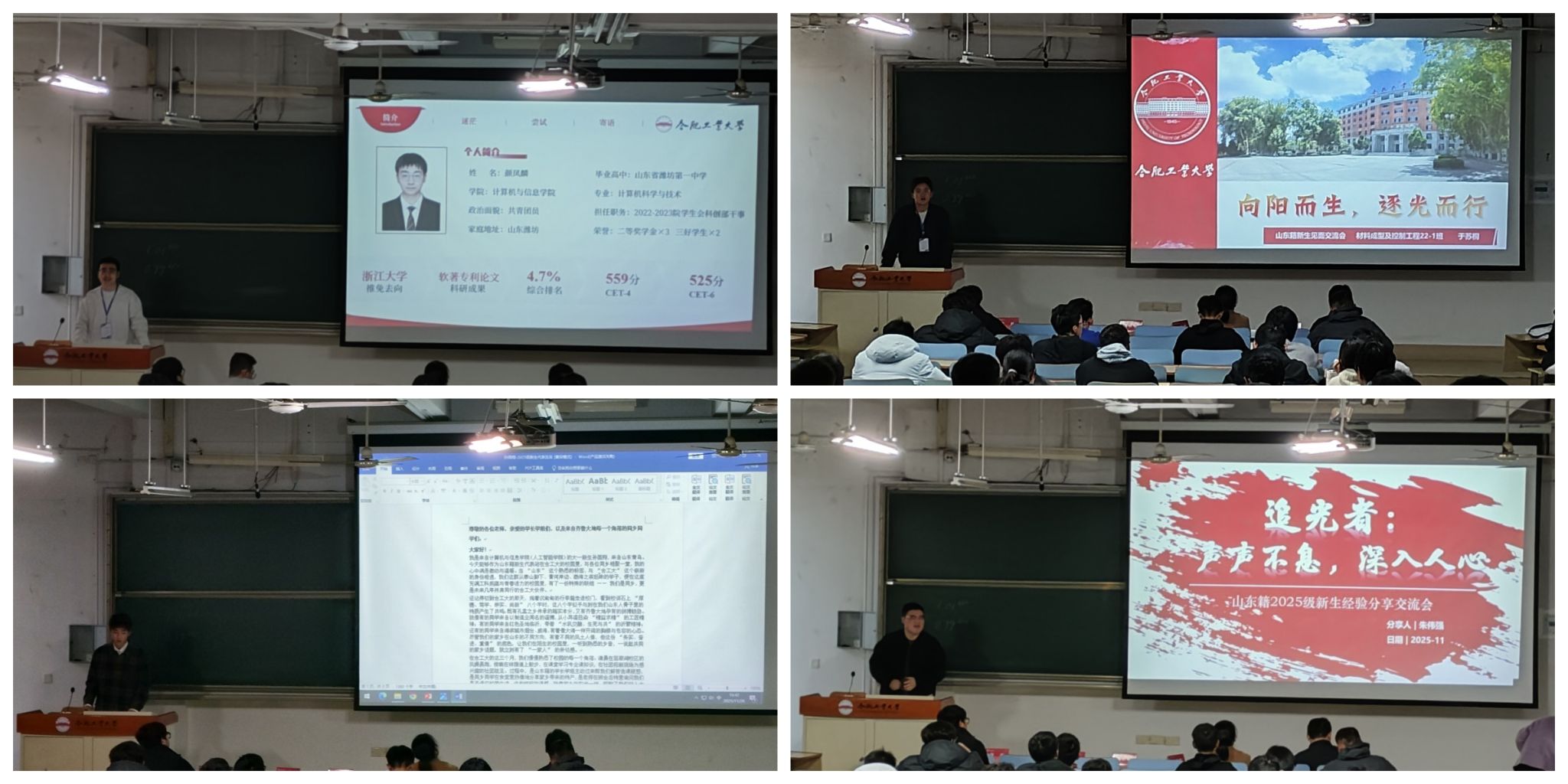 的3位山东籍优秀高年级代表以个人经历为出发点,分享了自己从迷茫到坚定的成长故事。在竞赛、学习与科研方面,颜凤麟学长向大一新生分享、强调“自学”、“坚持”的重要性,鼓励学弟、学妹们寻找自己的答案;在未来规划与品格塑造方面,于苏桐学长鼓励学弟、学妹们“早”做规划,自信担当,争创辉煌;在心路历程发展与转变方面,朱伟强学长将自身的经历转换成一个故事,向同学们分享了他是如何从一束不起眼的微光变成舞台上璀璨的亮光,激励同学们勇敢发声,大胆追寻自己的光。